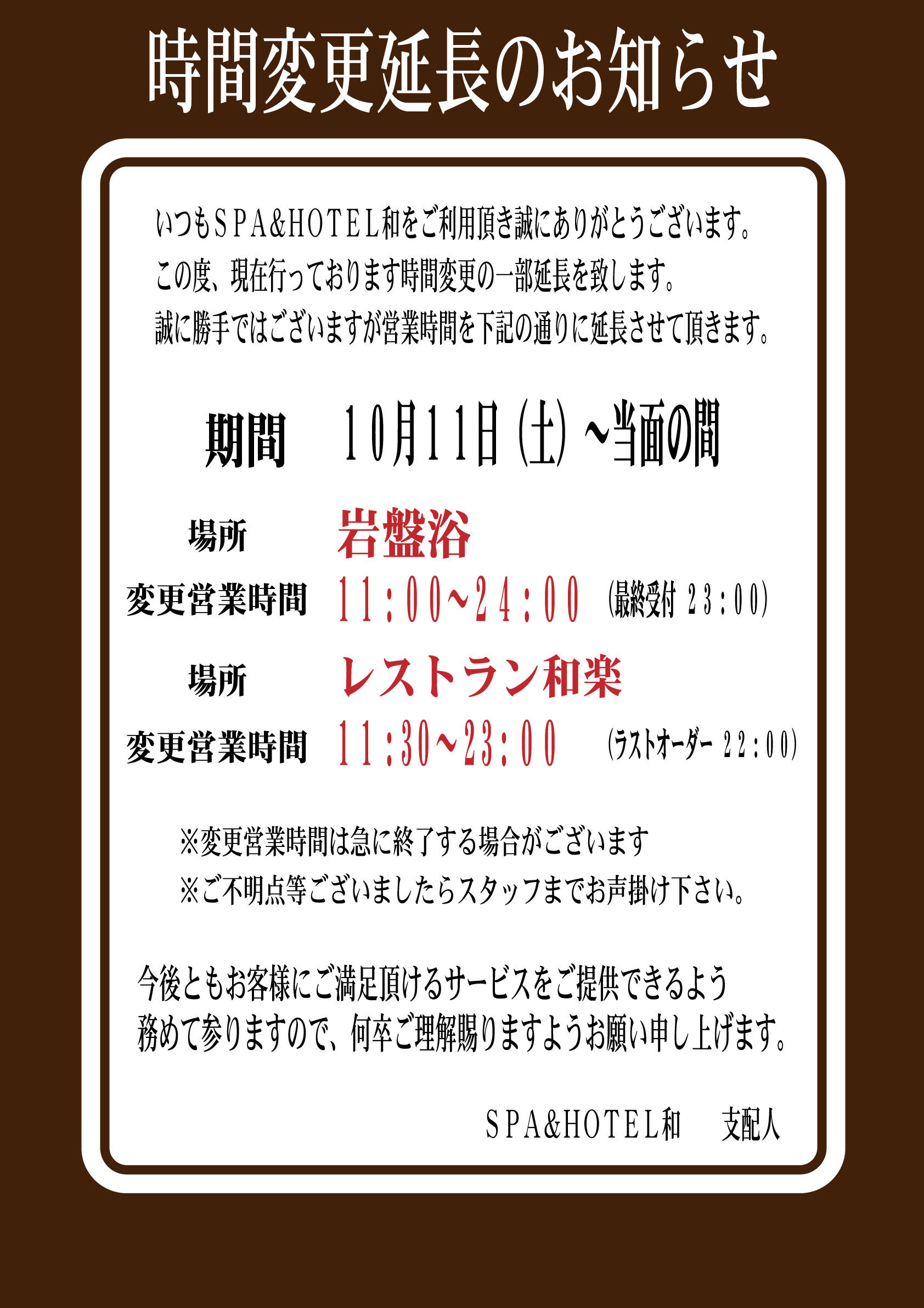 SPAご利用時間はAM11:00~AM9:00 (最終受付 AM8:00)となっております。